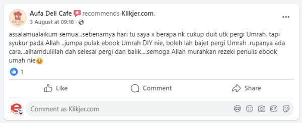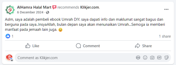 Ebook yang sangat bagus untuk panduan kita. Saya dah tetapkan perjalanan umrah bersama isteri 15 feb 2025 hingga 5 mac 2025. Tanpa ebook ini mungkin sukar bagi saya merancang perjalanan umrah DIY. Terima kasih kepada penulis ebook ini. Moga rezeki kita diluaskan lagi bersama-sama.